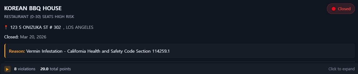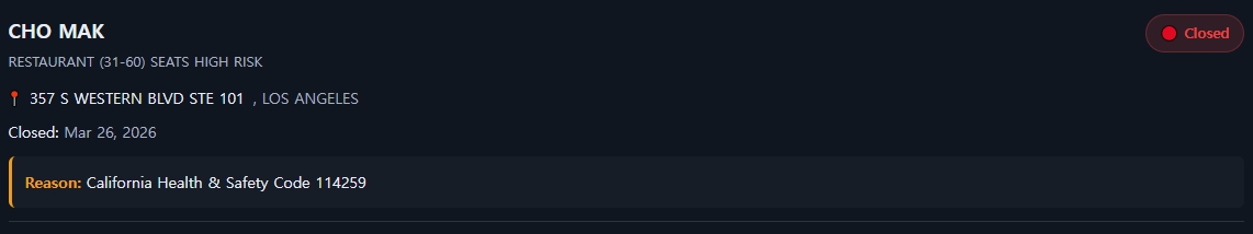 특히 두 업소 모두 ‘해충 또는 설치류 존재’ 항목이 중대 위반으로 적발되면서 즉각적인 폐쇄 조치가 내려졌다. 이 항목은 식품 안전에 직접적인 위해를 가할 수 있어 가장 강력한 제재 대상이다.