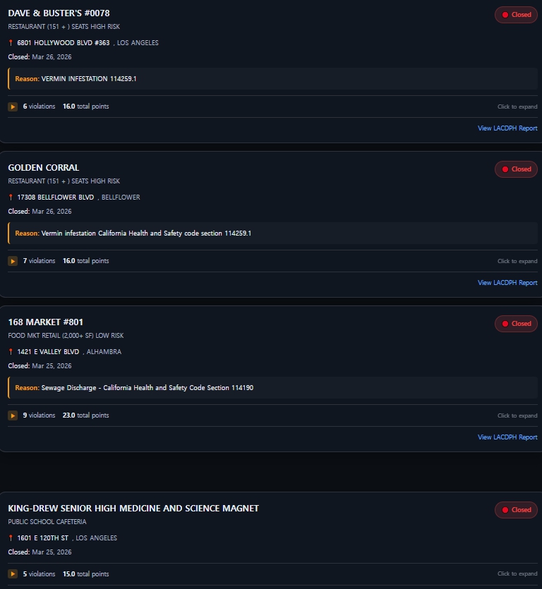 이와 함께 헐리우드의 데이브 앤 버스터스 매장 역시 해충 감염 문제로 3월 26일 임시 폐쇄됐으며, 조리 도구 위생과 시설 관리 전반에서도 추가 위반이 적발된 것으로 나타났다.