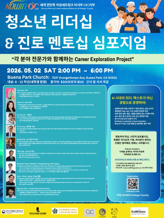 세계 한민족 여성네트워크 미서부 오렌지카운티 지부(KOWIN OC, 회장 김지현)는 오는 5월 2일 오후 2시부터 6시까지 부에나팍 교회에서 ‘청소년 리더십 & 진로 멘토십 심포지엄’을 개최한다.