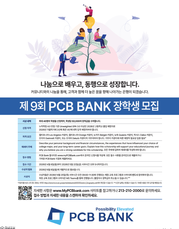 신청은 5 월 22 일 서부 시간 오후 5 시까지 PCB BANK 웹사이트(https://www.mypcbbank.com)를 통해 신청서와 필수 서류를 온라인으로 제출하면 된다. 최종 수상자는 6 월 8 일까지 개별 통보되며, 6 월 25 일에는 시상식과 함께 실질적인 재정 교육 프로그램이 진행될 예정이다.