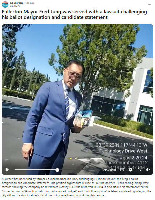 풀러턴 시장 프레드 정이 선거 공보물 허위 논란과 관련한 소송 서류 전달 직후 모습. 전 시의원 잰 플로리가 제기한 소송은 직업 표기와 성과 주장에 대해 허위·과장 여부를 문제 삼고 있다. 사진 출처: Reddit u/em2673