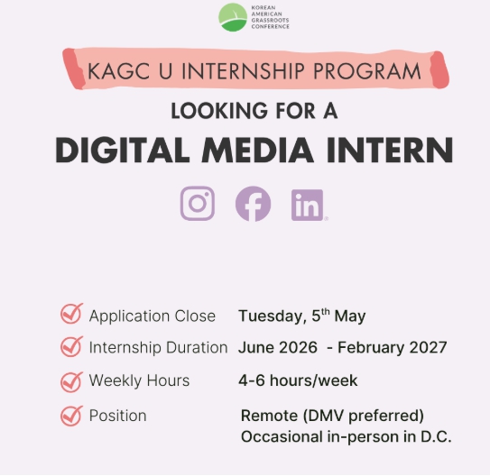 KAGC는 2026년 6월부터 2027년 2월까지 약 9개월간 진행되는 ‘KAGC U 디지털 미디어 인턴십 프로그램’을 운영한다고 밝혔다. 이번 인턴십은 비대면 파트타임 형태로 진행되며, 워싱턴 D.C., 메릴랜드, 버지니아(DMV) 지역 거주자를 우선 선발한다.
