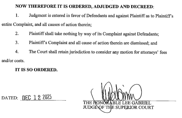법원은 2025년 11월 18일 피고 측의 약식판결(Motion for Summary Judgment)을 받아들였고, 12월 12일 원고의 모든 청구를 전면 기각했다.