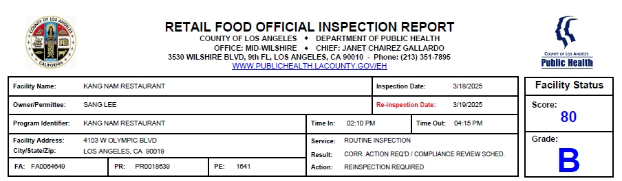 LA 카운티 보건국이 2025년 3월 강남회관에 대해 실시한 위생검사 결과 보고서