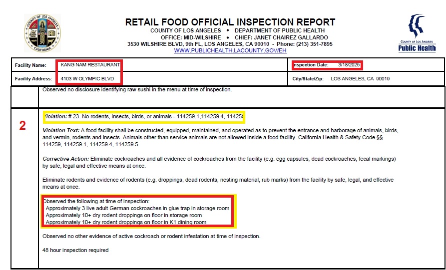 LA카운티 보건국 인스펙션 보고서에 따르면 강남회관은 지난 4월 9일 ‘해충 감염(Vermin Infestation)’ 위반으로 영업 중단 처분을 받았다. 이는 캘리포니아 보건안전법 §114259.1에 해당하는 중대 위반으로, 실제 설치류나 해충 존재가 확인된 경우에 적용된다.