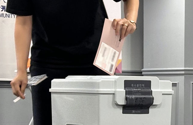 버지니아주 알렉산드리아 코리안커뮤니티센터에 마련된 제21대 대통령선거 재외투표 투표소에서 유권자가 기표하고 있다. 이번 대선 재외선거는 이날부터 오는 25일까지 전 세계 118개국 223개 투표소에서 진행된다.