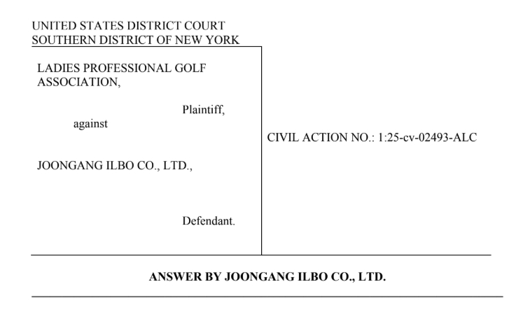 본보가 확인한 중앙일보의 답변서에 따르면, 중앙일보는 2026년 4월 2일 뉴욕 남부 연방법원에 답변서를 제출하고 LPGA의 청구를 대부분 부인했다. 중앙일보는 해당 문서에서 JTBC의 지급 의무가 존재한다고 하더라도 이를 대신 부담할 법적 책임이 없으며, 그 의무 자체도 아직 확정되지 않았다고 주장했다.