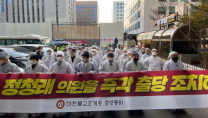 정 의원은 지난해 국정감사에서 해인사 문화재 관람료를 ‘통행세’에, 이를 걷는 사찰을 ‘봉이 김선달’에 비유했다가 불교계의 거센 반발을 산 바 있다. 불교계는 정 의원 출당을 요구하며 민주당을 항의방문하는 등 해를 넘기며 진통이 계속되는 상황이다.