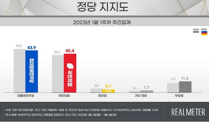 정당 지지율은 국민의힘은 전주 대비 1.2%포인트 하락한 40.4%, 더불어민주당은 1.6%하락한 43.9%로 집계됐다. 양당 지지율 격차는 3.5%포인트로 오차범위 내다.