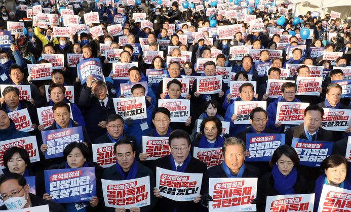 더불어민주당 이재명 대표, 박홍근 원내대표, 당 지도부 등 의원들이 4일 서울 세종대로에서 열린 윤석열정권 민생파탄-검사독재 규탄 국민보고대회에서 윤 정권을 규탄하고 있다.