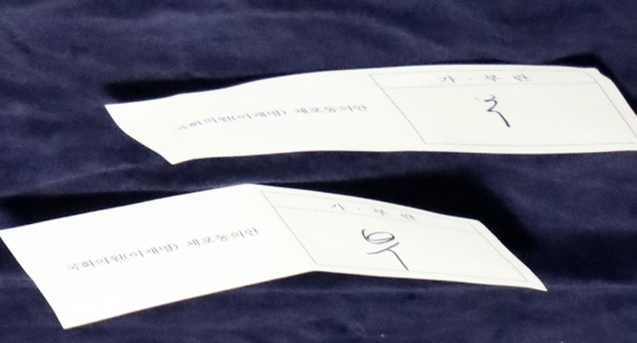 김 의장은 오후 4시께까지 검표가 지연되자 양당 원내대표를 불러 의견을 물었다. 김 의장은 이후 “지금 개표 과정에서 부(不)냐 또는 무효표냐를 판가름하기 힘들 중간의 표가 두장 나온 것 같다”며 “저는 아직 못 봤다”고 발언했다.