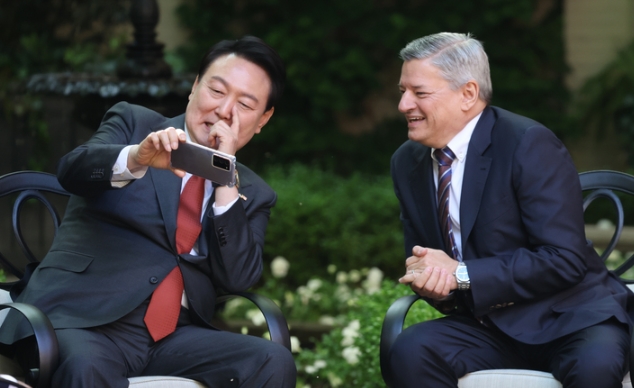윤 대통령과 김 여사, 서랜도스 대표는 공동언론발표에 앞서 야외 정원에 타원형으로 마련된 의자에 앉아서 환담을 나눴다.