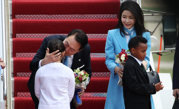 한편 미국을 국빈 방문 중인 윤석열 대통령은 24일 오후(현지시간) 미국 워싱턴DC 인근 앤드루스 공군기지에 도착해, 환영행사에서 꽃다발을 선물한 화동의 볼에 가볍게 입맞추며 답례했다.