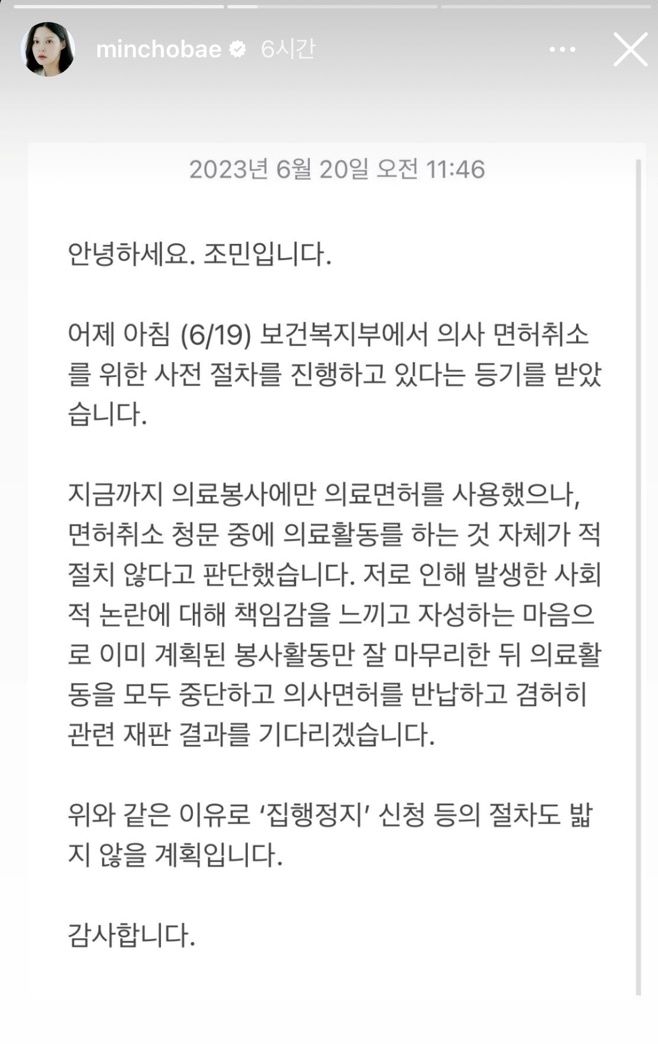 조씨는 이날 오전 자신의 사회관계망서비스(SNS)를 통해 “어제 아침 보건복지부에서 의사 면허취소를 위한 사전 절차를 진행하고 있다는 등기를 받았다”며 “의료활동을 모두 중단하고 의사면허를 반납하고 겸허히 관련 재판 결과를 기다리겠다. 위와 같은 이유로 ‘집행정지’ 신청 등의 절차도 밟지 않을 계획”이라고 밝혔다.