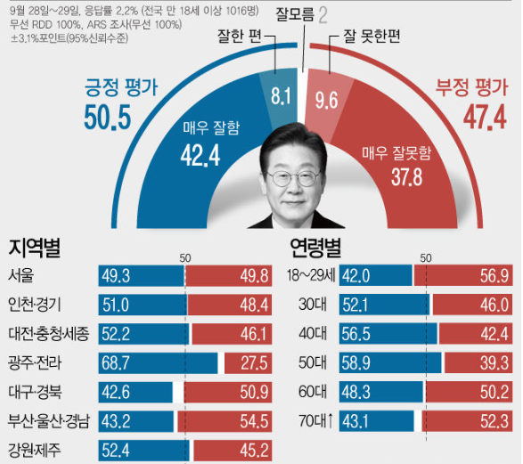 이재명의 국정 수행 지지율이 50.5%라는 여론조사 결과가 1일 나왔다.