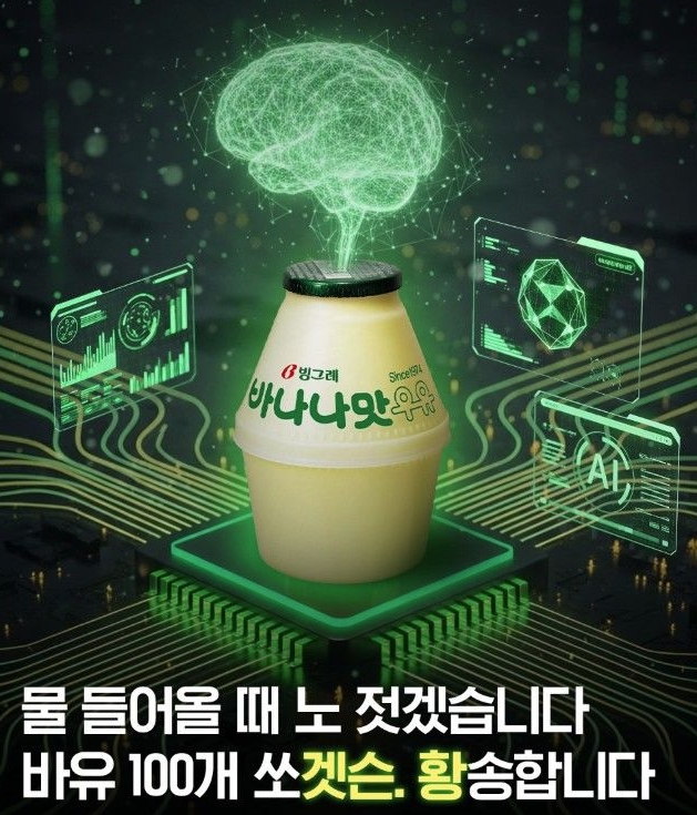 빙그레는 SNS에 “AI(인공지능) 선택을 받은 바나나맛 우유 등장”이라며 “너무 황송해서 이 글을 보는 100명에게 달콤한 바나나맛 우유 쏘겠다”고 했다. 오는 6일까지 게시물에 댓글을 단 100명을 선정해 바나나맛 우유 모바일 기프티콘을 전할 예정이다.