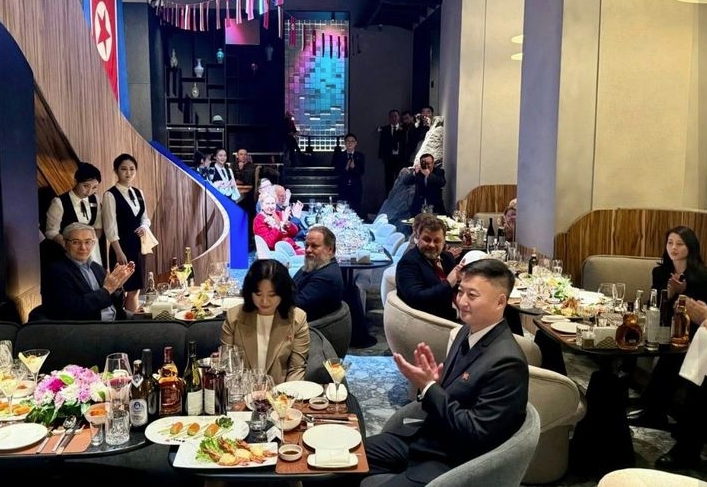 공개된 사진을 보면, 테이블에는 북한 전통음식뿐만 아니라 고급 횟집을 연상케 하는 모둠회와 바닷가재, 양주와 와인 등도 보였다.