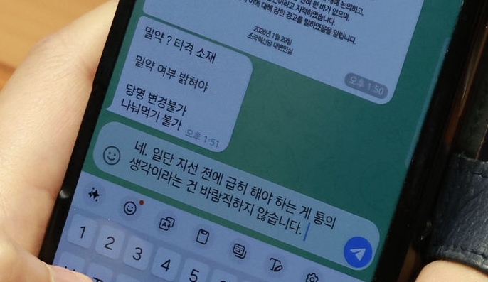 뉴시스가 국회 본회의장에서 촬영한 사진에 포착된 텔레그램 메시지에 따르면, 한 국무위원이 민주당 소속 모 의원에게 조국혁신당 대변인실 입장문을 공유하며 “밀약? 타격 소재”, “밀약 여부 밝혀야”, “당명 변경 불가”, “나눠먹기 불가” 등 메시지를 보냈다.