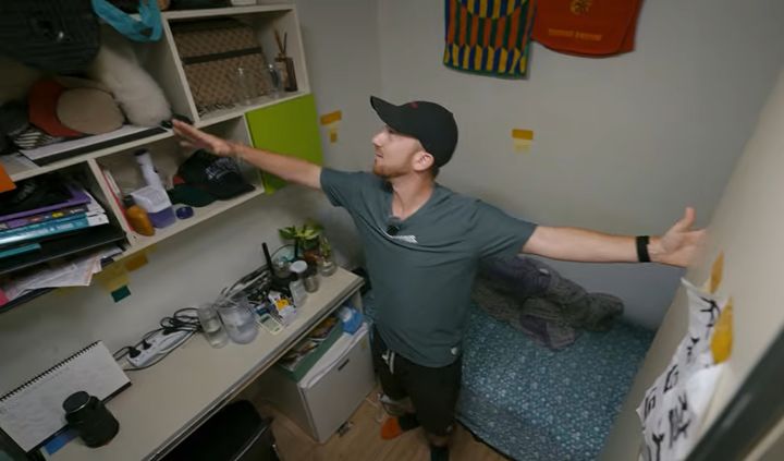 그는 “이게 공간의 전부”라면서 양팔을 뻗으면 꽉 차는 방 크기를 보여줬다.