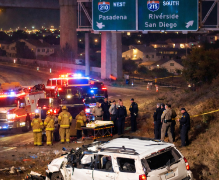 캘리포니아 고속도로순찰대(CHP) 인랜드 디비전 대변인은 10일 밤 9시45분쯤, 서쪽 방향 210 프리웨이를 달리던 쉐보레 서버번이 215 프리웨이와 만나는 지점에서 제어를 잃고 제방 아래로 추락했다고 밝혔다. 사고 지점 인근에는 여러 채의 주택이 있는 주거 지역이 인접해 있다.