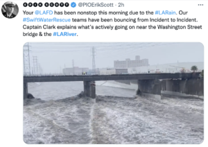 LA에 내린 비로 LA 강의 물이 블어나면서 3대의 차량이 강물에 휩쓸려 강물에 빨려 들어갔다고 LA 소방국은 밝혔다.