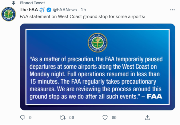 미국 연방항공청(FAA)은 11일 공식 트위터를 통해 “예방적 조치 차원에서 10일 밤 서부 해안 일부 공항에서의 이륙을 일시 정지시켰다”라고 밝혔다. 조치는 15분 이하로 유지됐다고 FAA은 전했다.