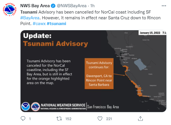 15일 CNN, AP통신에 따르면 미국 국립기상청(NWS)은 이날 캘리포니아와 오리건, 워싱턴, 알래스카를 포함한 미 서부 해안 지역에 쓰나미 경보가 발효 중이라고 발표했다.