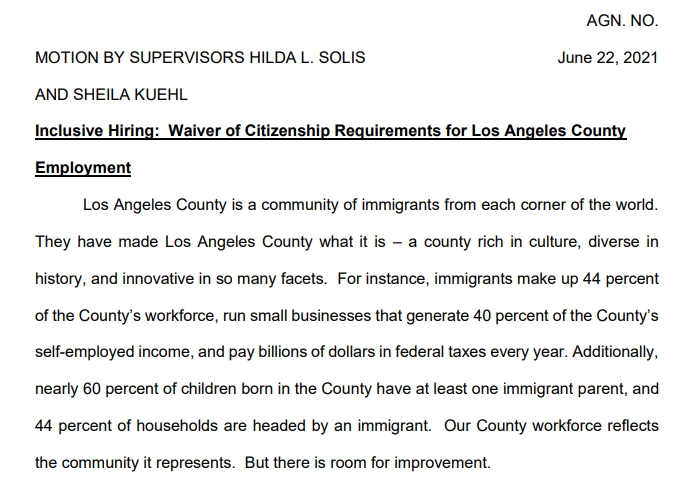 힐다 솔리스 위원장은 성명을 통해 “LA카운티는 세계 각지에서 온 이민자들의 커뮤니티”라며 “이 지역에서 가장 큰 고용주 중 하나인 카운티가 포용적인 자세로 시민권이 고용의 장벽이 되는 것을 허용하지 않을 것을 약속힌다”고 밝혔다.