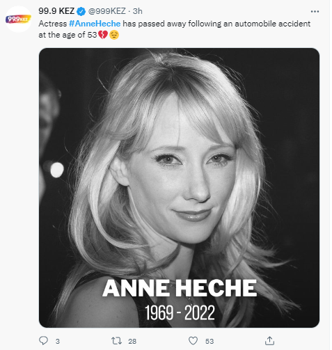 할리웃 스타 배우 Anne Heche가 혼수 상태에 빠진 지 일주만인 오늘 깨어나지 못한 채 결국 사망했다.