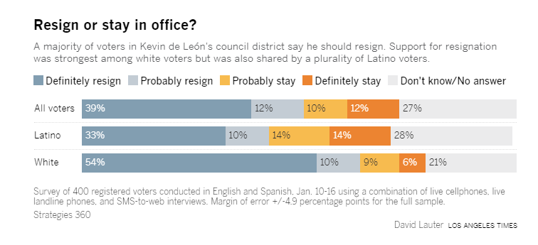 인종별로는 백인 유권자의 64%가 케빈 드레온 시의원의 사임을 원했고 라티노 유권자의 43%가 시의원의 사임이 필요하다고 답했다.