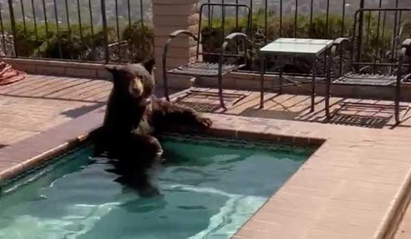 버뱅크 한 가정집 수영장에 곰이 자리잡고 앉아 있는 모습이 공개돼 화제가 되고있다.