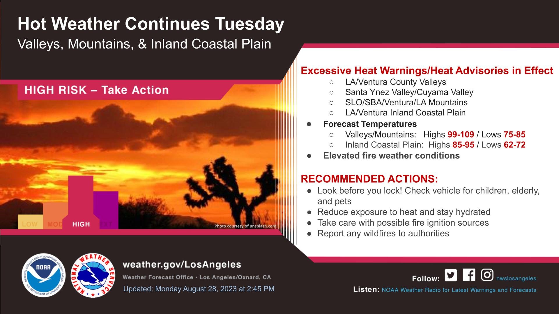 국립기상청은 남가주에 28일부터 일부 지역에는 낮 최고 기온이 세자릿수 온도를 기록하는 등 폭염이 이어질 것이라고 밝혔다.