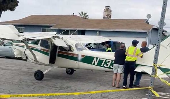 다우니 소방서는 비행기 조종사 한 명이 탑승한 단발 엔진 비행기가 불시착하면서 도로에 있던 자동차를 들이받았다고 밝히고 비행기 날개가 손상되면서 항공기 연료 29갤런이 도로에 쏟아졌다고 밝혔다.