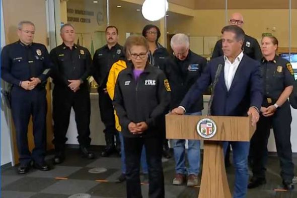 LA시 정부 관계자들이 5일 폭우관련 기자회견을 갖고 있다. LA 카운티