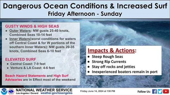 해안가에는 거센 바람으로 이안류가 유입될 가능성이 있어 물놀이를 할 경우 주의해야 한다고 밝혔다. LA 인근 바닷가에는 최대 6피트 높이의 파도가 일 것으로 예보했다.