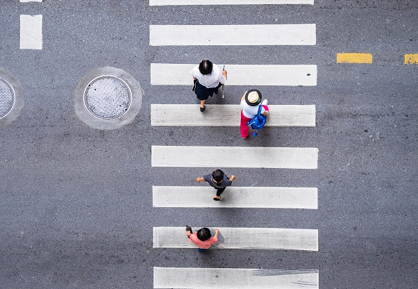 Aerial photo top view of people walk on street in the city over pedestrian crossing traffic road