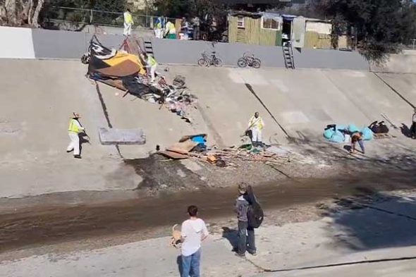 LA시가 하일랜드 파크 홍수 수로에서 노숙자 텐트 등을 철거하고 있다. X@tarantulaarms