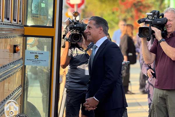 알베르토 카발효 교육감이 마르케즈 차터 초등학교 앞에서 직접 스쿨버스에서 내리는 학생들을 맞이하고 있다. X@LASchoolPolice