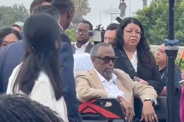 커렌 프라이스 시의원이 LA 컨벤션센터 리노베이션 행사에서 쓰러져 응급요원들에 의해 이동하고 있다. X@EBMediaGroup