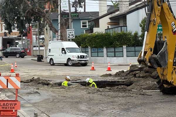 LADWP는 7일 오전 베니스 지역에서 대형 싱크홀이 발생한 후, 작업자들이 수도관 파열과 도로 파손 복구 작업을 진행하고 있다고 밝혔다.