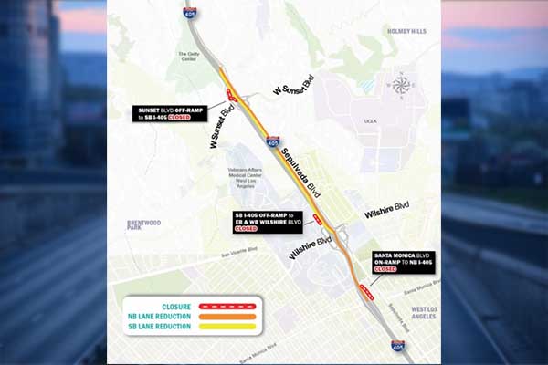 이번 공사는 밴나이스와 웨스트우드를 잇는 구간에서 진행 중인 총 1억 4,300만 달러 규모의 I-405 포장 재정비 프로젝트의 일환이다. 이에 따라 405번 프리웨이는 방향별로 각각 3차선으로 축소 운영된다.