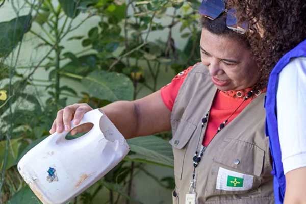 한 보건 담당자가 버려진 플라스틱통의 고여있는 물을 확인하고 있다. 세계보건국WHO