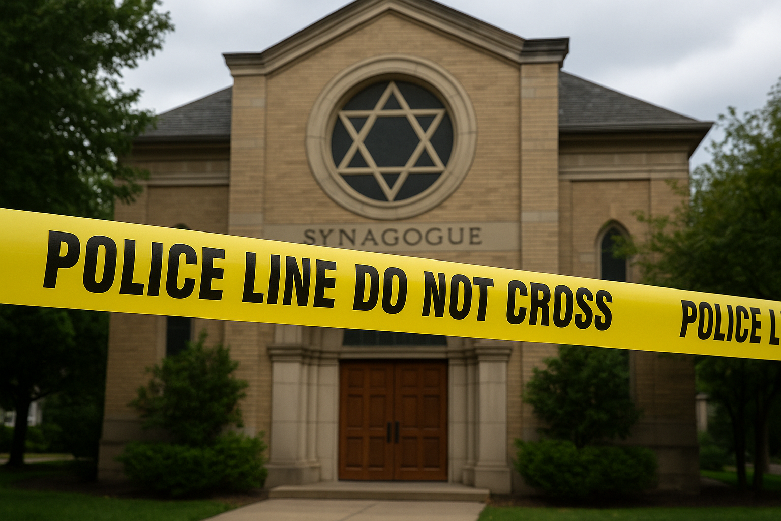 폭탄 위협 사건 이후 경찰 폴리스라인이 설치된 시나고그 외관. 최근 소셜미디어를 통한 테러 협박이 잇따르며 보안 경계가 강화되고 있다. (Image generated)