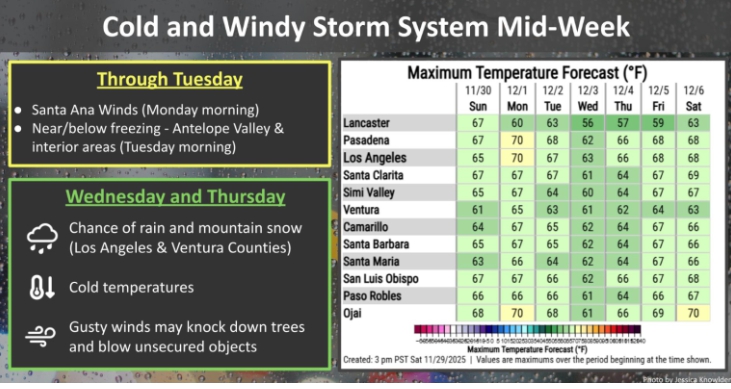 강력한 폭풍 시스템이 남가주로  밀려오면서 이번 주 LA와 벤추라 카운티 전역에 강풍과 급격한 기온 하강이 이어질 전망이다.