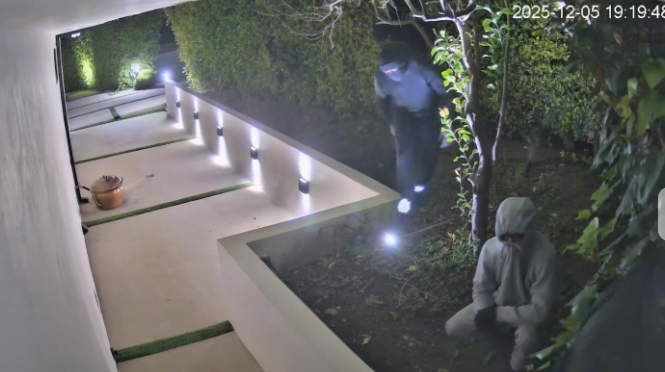 절도단 4명이 주택 뒤편 생울타리를 통해 침입하는 모습이 외부 감시카메라에 기록됐다. 사진 제공: 주택 소유주 via ktla
