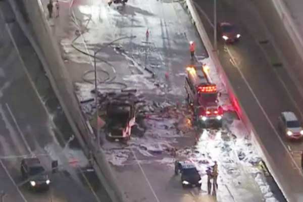 101 프리웨이 바로 남쪽, 북쪽 방향 405번 프리웨이 연결로에 정차한 전소된 트럭이 포착됐다.