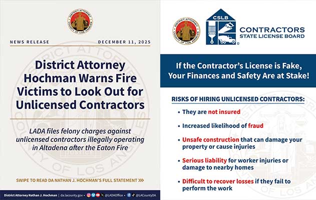 바거 수퍼바이저는 호크먼과 함께 “무면허 시공업체는 용납되지 않을 것”이라고 강조하며, “이는 위협이 아니라 약속”이라고 말했다. “산불 피해자들을 이용하는 사람들에게 모든 법의 무게가 강하게 적용되도록 최선을 다할 것”이라고 덧붙였다.