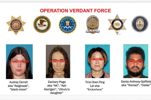 15일 오전 기자회견에서 중부 연방사법지구 제1부연방검사장 빌 에사일리는 LA 일대에서 체포된 4명을 오드리 캐럴(30), 재커리 애런 페이지(32), 단테 개필드(24), 티나 라이(41)로 공개했다. 이들은 공모 및 미등록 파괴장치 소지 혐의로 기소됐다.