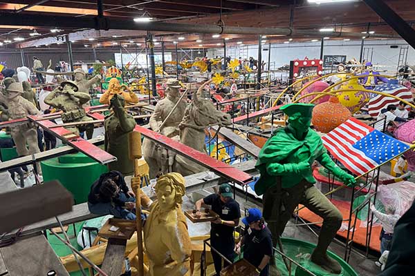 로즈 퍼레이드를 장식하게 될 꽃차 장식에 많은 자원봉사자들이 참여해 작업하고 있다.