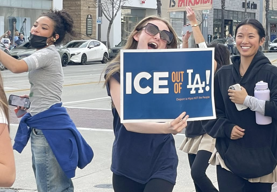 파사데나 콜로라도 불러바드에서 열린 동맹휴업 시위에서 한 학생이 ‘ICE OUT OF LA(이민세관집행국은 LA에서 떠나라)’라고 적힌 피켓을 들고 환하게 웃으며 행진하고 있다. 출처:스레드